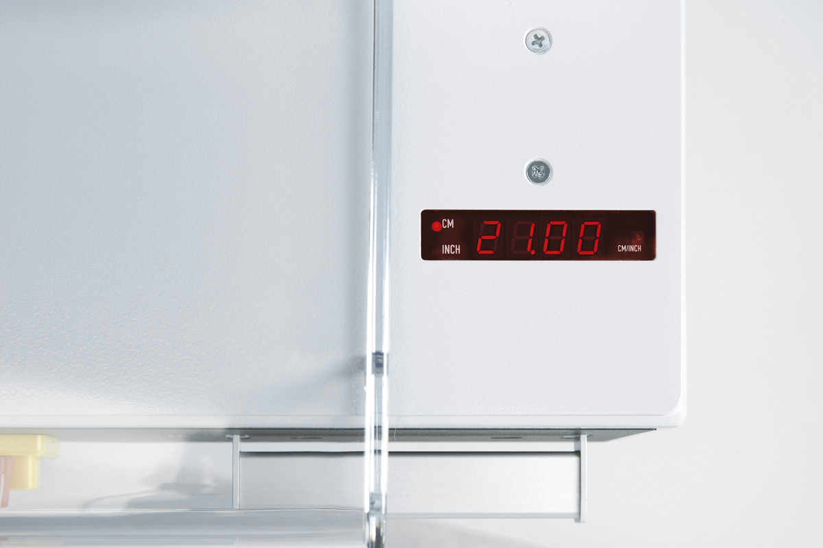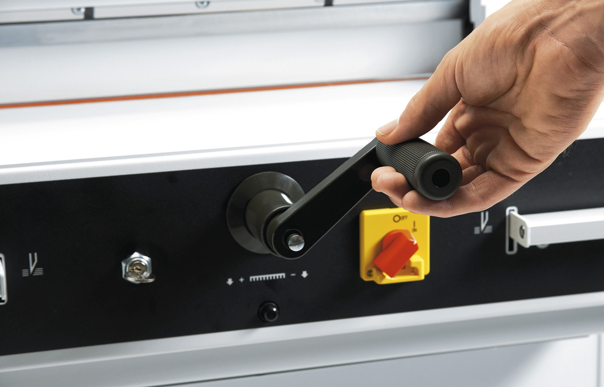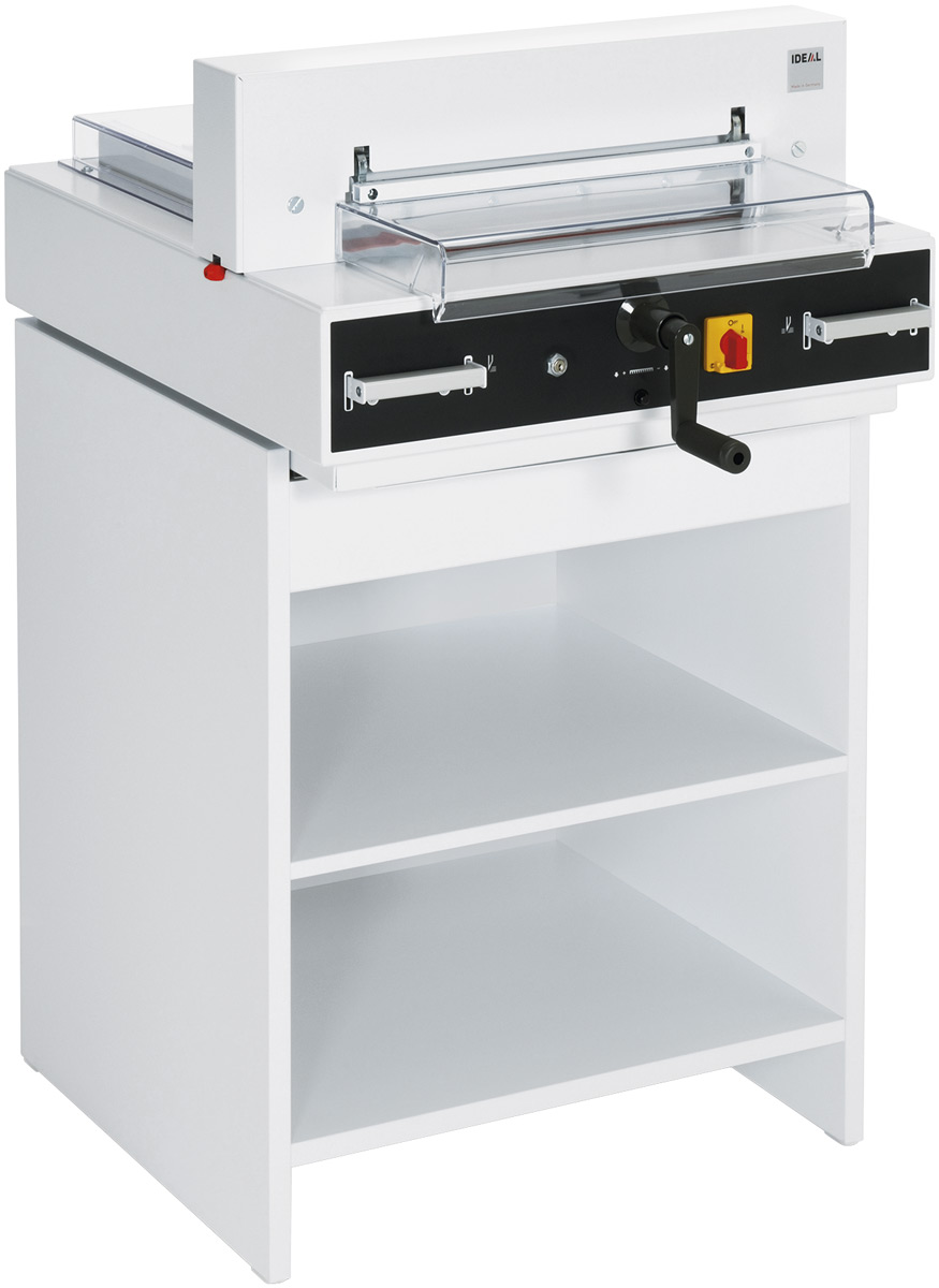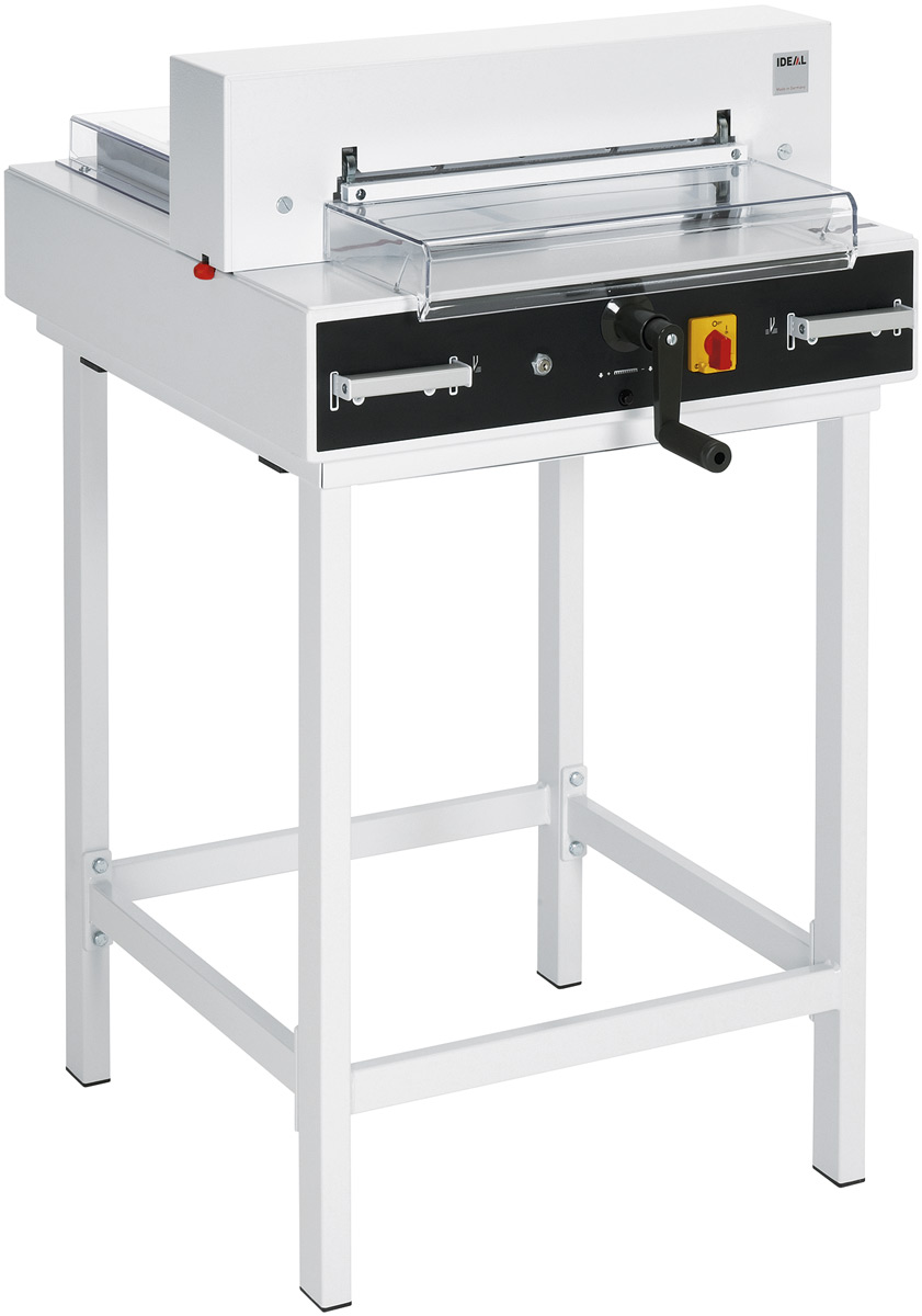 Komfortabler, elektrischer Büro-Stapelschneider mit EASY-CUT und automatischer Pressung. Mit neuer, patentierter EASY-CUT Schnittauslösung. Besonders sicher durch SCS – Safety Cutting System: mit elektronisch kontrollierter, schwenkbarer Sicherheitsvorrichtung auf dem Vordertisch und transparenter Sicherheitsvorrichtung auf dem Rücktisch; Hauptschalter und Sicherheitsschloss; Zweihand-Schnittauslösung; 24-Volt-Steuerung; patentierter Sicherheitsantrieb; automatischer Messer- und Pressbalkenrücklauf aus jeder Position; Scheibenbremse für sofortigen Messerstopp; einfacher Messerwechsel von vorne; Messerwechsel-Vorrichtung mit abgedeckter Messerschneide; Messertiefgangverstellung von außen; einfacher, sicherer Schnittleistenwechsel. Elektro-mechanischer Messerantrieb. Schneidet Papierstapel (ca. 500 Blatt Papier 70 g/m²) oder gebundene Broschüren bis 40 mm Höhe. Vollstahl-Messerträger. Hochwertiges Messer aus Qualitäts-Messerstahl. Gehärtete, einstellbare Messerführungen. Spindelgeführter Rückanschlag mit Handkurbel und Digital-Maßanzeige, umschaltbar cm / inch. Patentierte, automatische Pressung. Optischer Schnittandeuter mit Leuchtdioden (LEDs). Seitenanschlag. Stabile Ganzmetall-Konstruktion. Lieferbar als Tischgerät; Untergestell oder Unterschrank mit Fachboden gegen Aufpreis. Maße (HxBxD): 355 x 640 x 870 mm. Höhe mit Untergestell 1085 mm. Höhe mit Unterschrank 1080 mm. Gewicht: 86 kg / 96 kg mit Untergestell / 118 kg mit Unterschrank. Schnittlänge 430 mm. Schnitthöhe 40 mm. Restschnitt 35 mm. Einlegetiefe 435 mm.