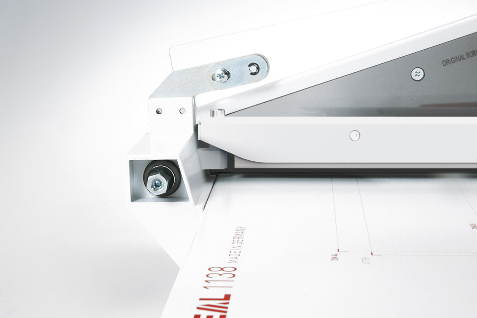 Nachschleifbare Messergarnitur aus „Solinger Messerstahl”. Transparente Schutzvorrichtung aus bruchsicherem Kunststoff – die Messerschutz-Automatik hebt und senkt sich mit der Messerbewegung. Solide Handhebelpressung für individuell dosierbaren Pressdruck. Seitenanschlag mit Maßskala in mm/Zoll.