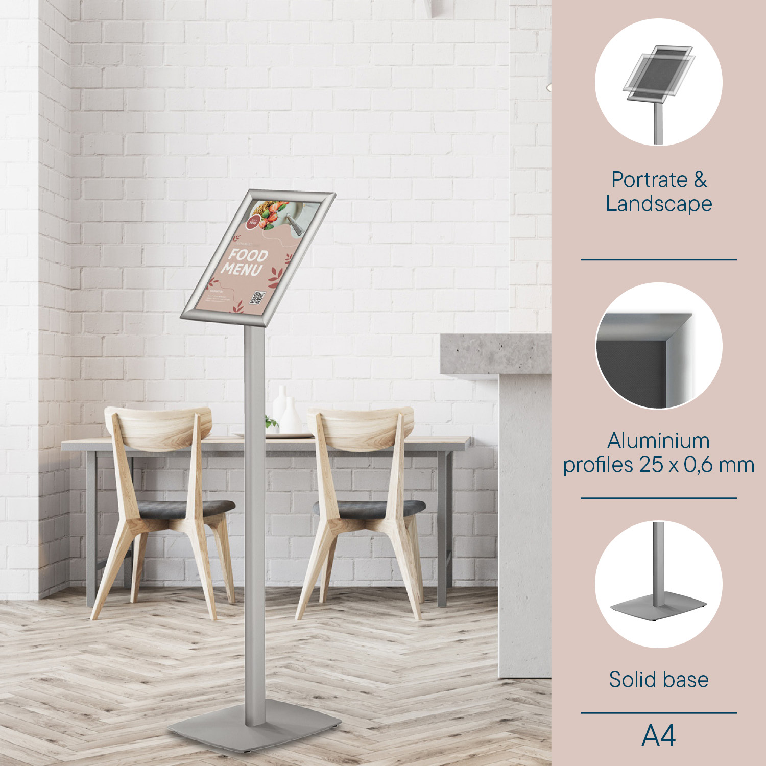 Klassischer Design-Informationsständer inklusive Klapprahmen mit Gehrungsecken in A4-Format (355001). Easy-Click-System für eine schnelle, einfache und repräsentative Präsentation. Klapprahmen aus eloxiertem Aluminium mit Kunststoffrücken. Die klare transparente Antireflexfolie (PET) schützt das Poster vor Schmutz und Feuchtigkeit. Ständer ist einfach zu montieren. Der Klapprahmen kann entweder vertikal oder horizontal aufgestellt werden. Sockel 320x245 mm aus 4 mm Stahl. Ständerhöhe 900 mm. Höhe inklusive Klapprahmen A4 Hochformat 1100 mm. Klapprahmen ist in einem Winkel von 38º montiert. Farbe: Grau.