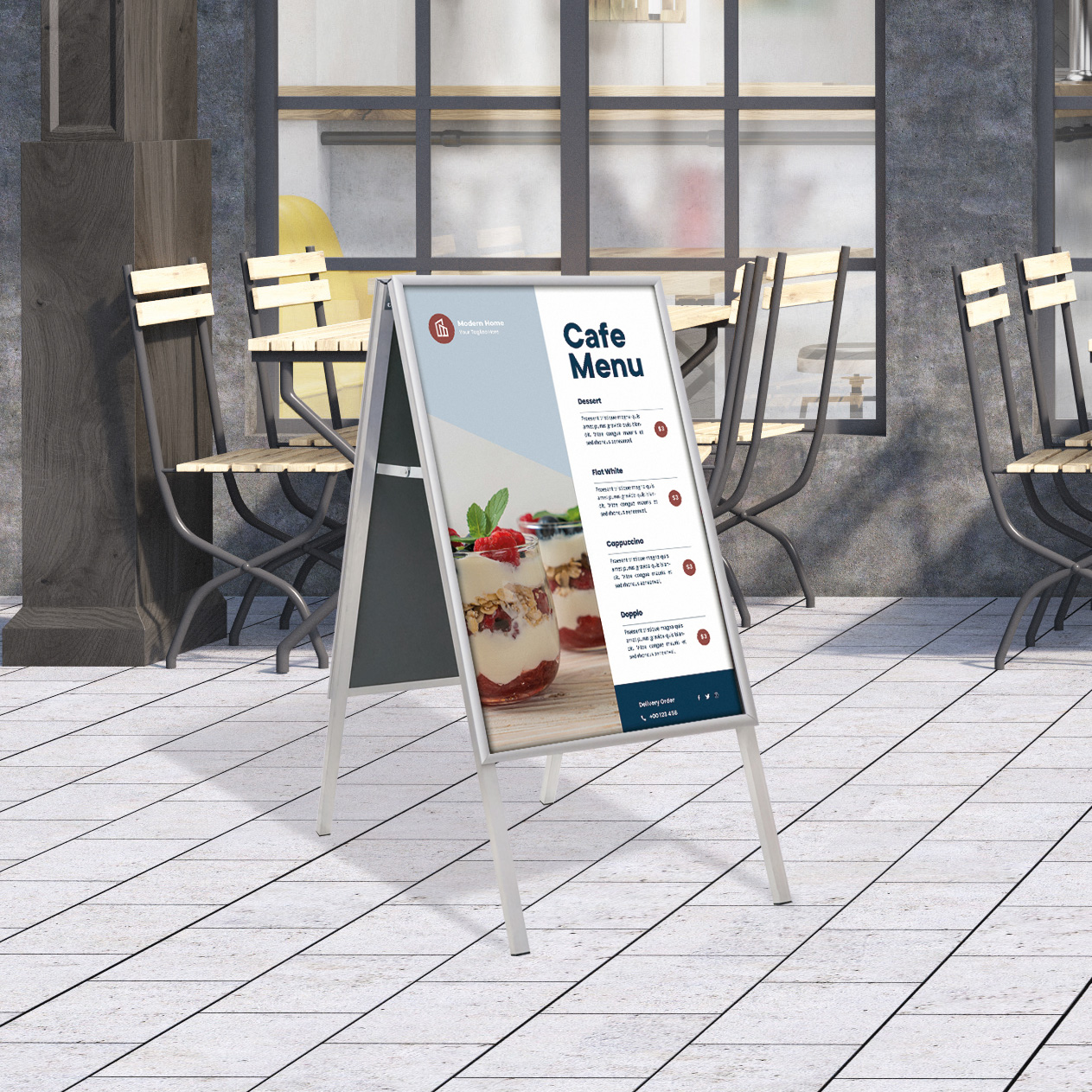 Kundenstopper A-Frame Classic mit einem 25mm breiten Profil Klapprahmen. Hochwertiger Klapprahmen aus eloxiertem Aluminium mit Gehrungsecken, grauer Polystyrol-Rückplatte und transparenter, blendfreier Schützfolie. Mit einem Easy-Click-System für schnelle und einfache Präsentation. Geeignet für das A1-Papierformat. Der Kundenstopper ist spritzwasserbeständig.