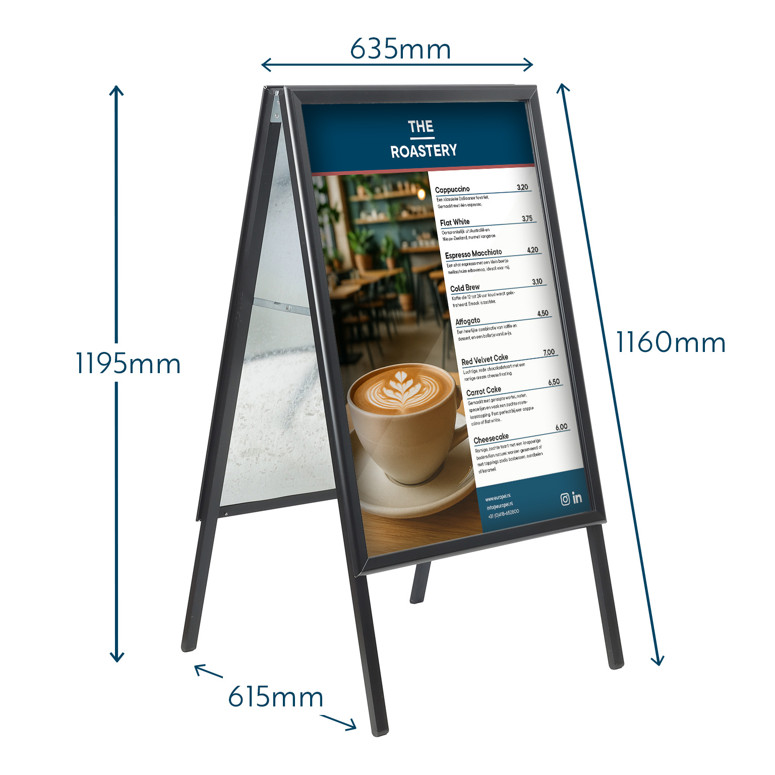 Dank des leichten, aber robusten Aluminiumrahmens lässt sich das Schild einfach bewegen. Mit dem 32-mm-Klapprahmen wechseln Sie Ihre Plakate in Sekunden. Das A1-Format bietet viel Platz für auffällige Werbung oder starke Aktionen. Die schwarze Oberfläche wirkt modern und professionell, während die entspiegelte Folie dafür sorgt, dass Ihre Botschaft selbst bei Sonnenlicht gut lesbar bleibt.