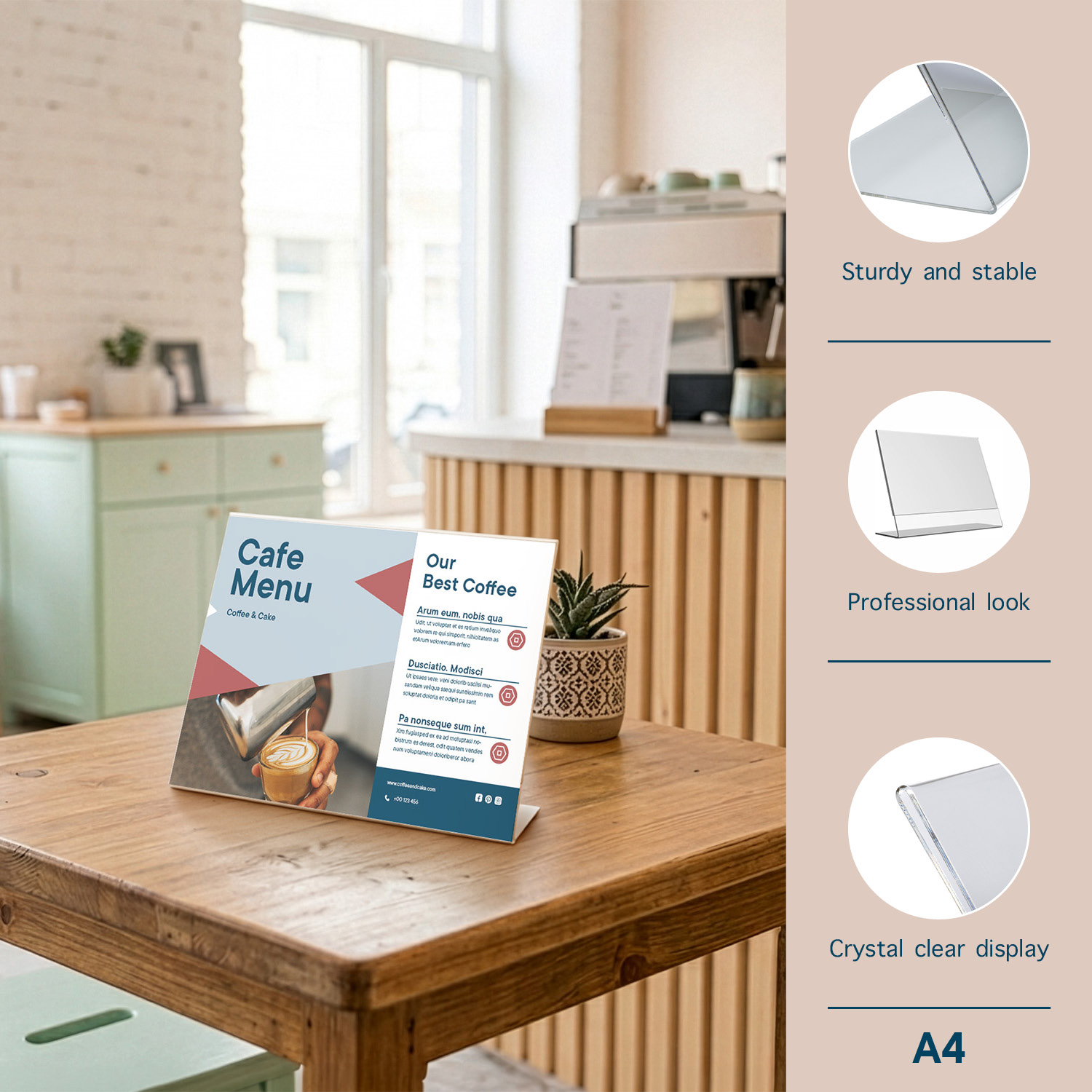 Europel Tischaufsteller, L-Standard, für eine repräsentative Präsentation Ihrer Flyers und Grafiken. Der übersichtliche Aufbau ermöglicht den Blick auf das gesamte Bild auf dem Display. Entwickelt, um Ihre Broschüren auszutauschen, indem Sie das Papier durch den Boden oder die Seiten schieben. Idealer Aufsteller, um Werbeaktionen, Restaurantmenüs, Warnhinweise vor Schmutz und Staub zu schützen. Material: Klares Acryl. Größe: A4. Modell: Querformat.