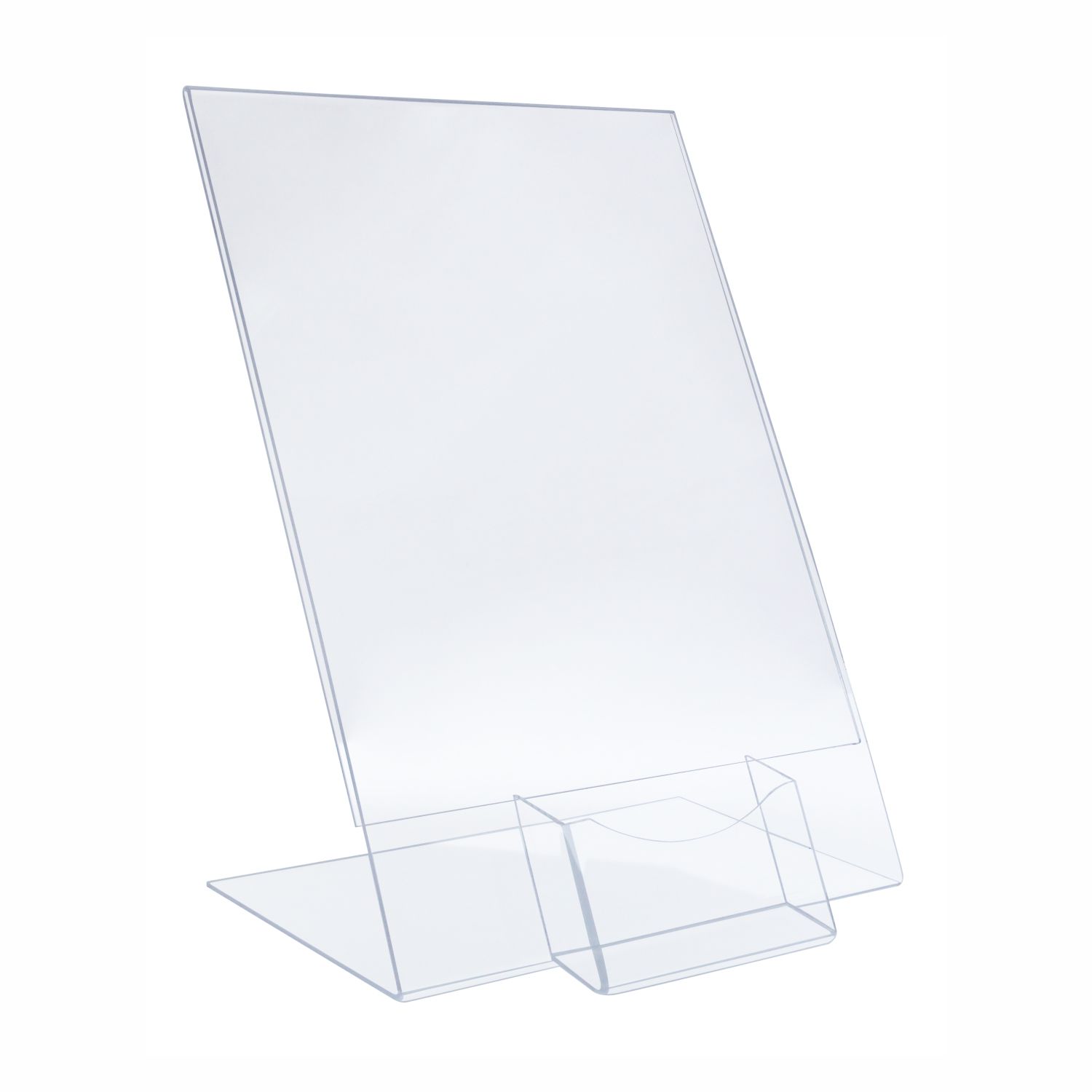 *Tischaufsteller zur repräsentativen Präsentation von Prospekten und Preiskarten.*L-Standard. * Hochwertiges kristallklares Acryl. *Geeignet für A4 Hochformat. *Vorderseite mit Visitenkartenhalter Kapazität 20 mm. *Außenmaße HxBxT 297x210x150mm