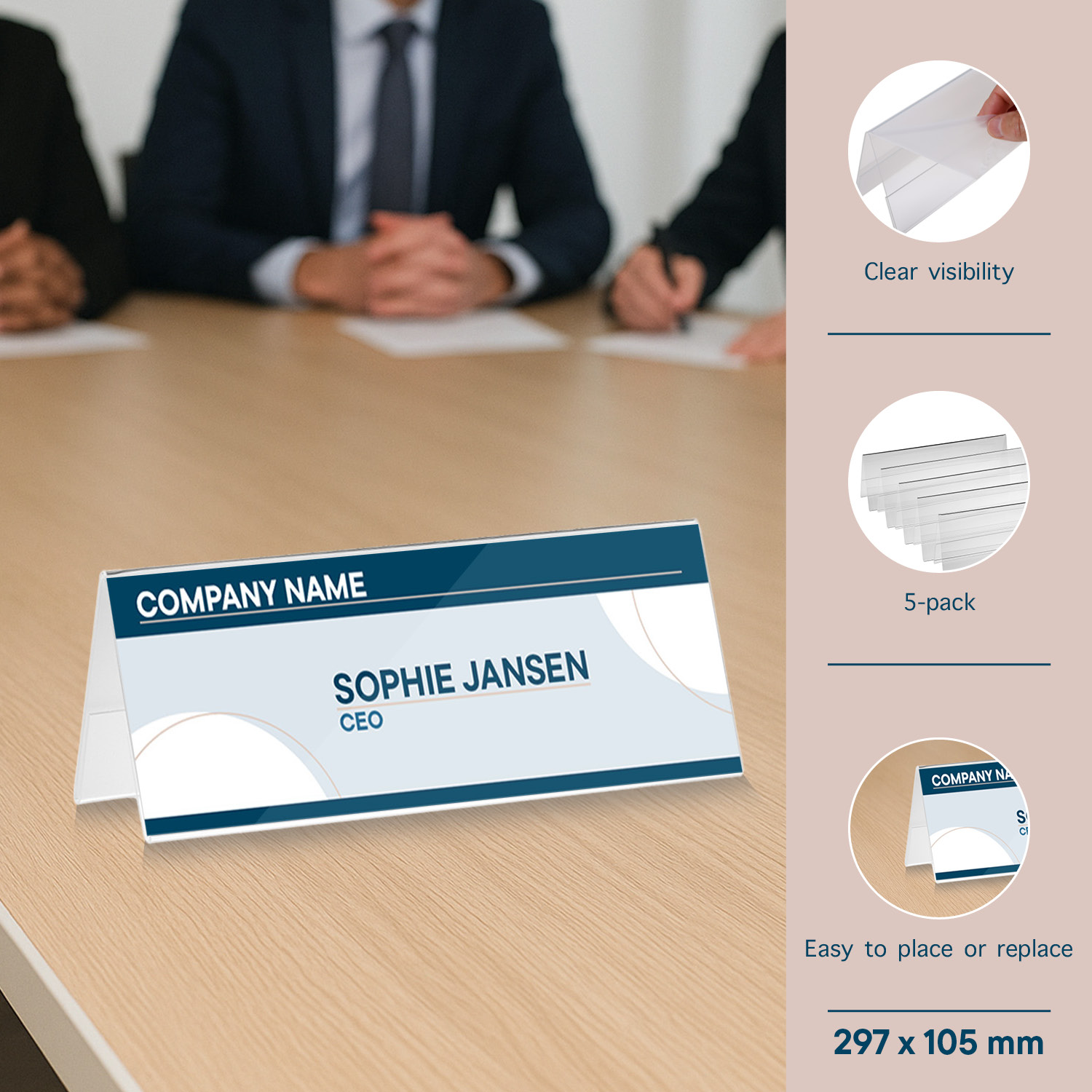Die Unterseite verfügt über eine Einstecköffnung, über die Namenskarten schnell und einfach eingelegt oder ausgetauscht werden können. Mit dem praktischen Format 210 × 75 mm passt der Halter perfekt auf Tische mit begrenztem Platzangebot.