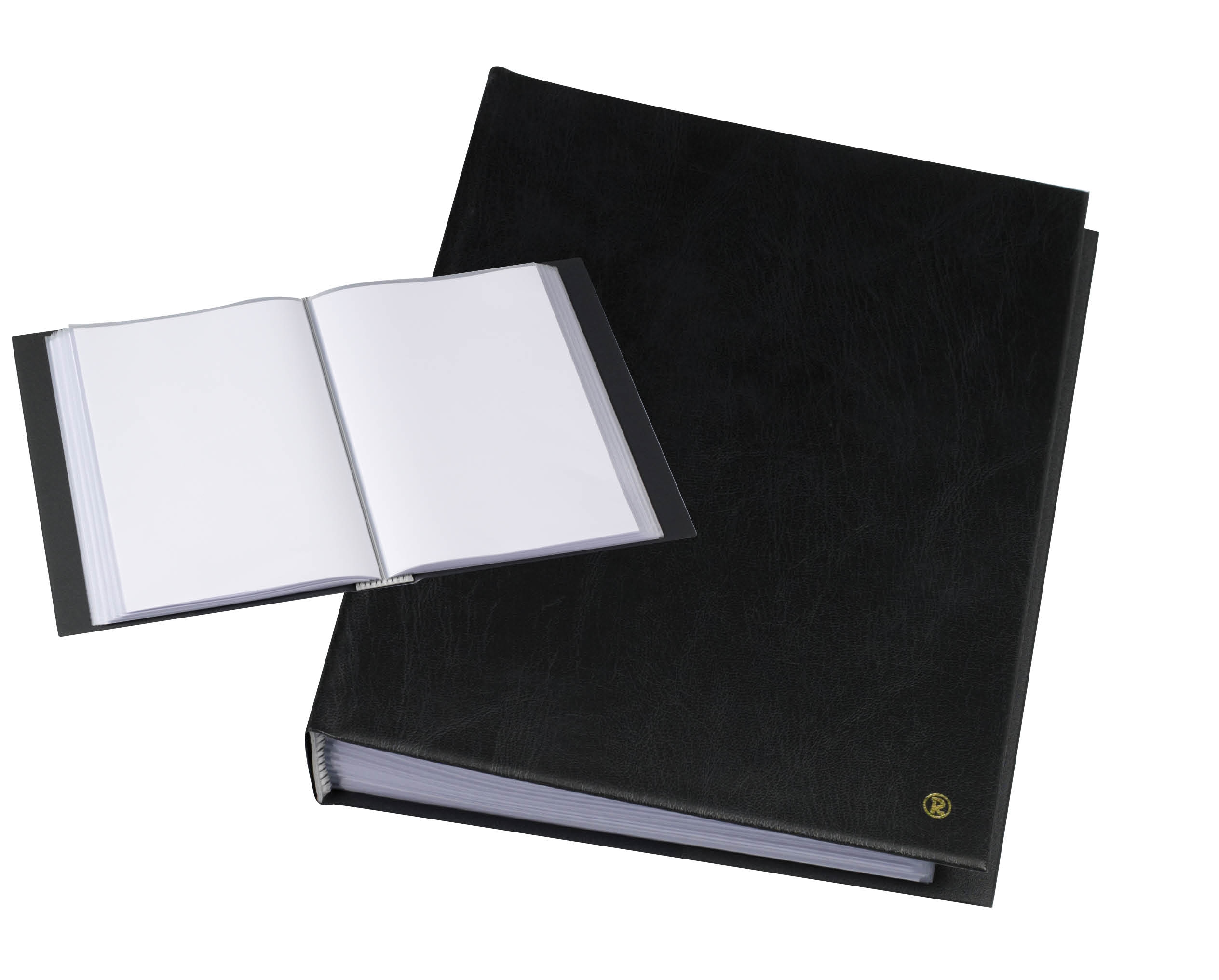 Dieses A4-Sichtbuch ist mit 120 Hüllen hergestellt aus säurefreiem Polypropylen (= 240 Sichtseiten) in der Farbe Schwarz erhältlich. Es ist mit dem bekannten Rillstab-Mechanismus ausgestattet. Die Hüllen werden mittels Stäben in einem Kanal gehalten. So können Sie wie in einem Buch blättern. Und Sie haben zum Beispiel bei A3-Dokumenten keinen Bildverlust. Die Anzahl der Kanäle hängt von der Anzahl der Hüllen ab. Dadurch können die Rückenbreiten unterschieldich sein.