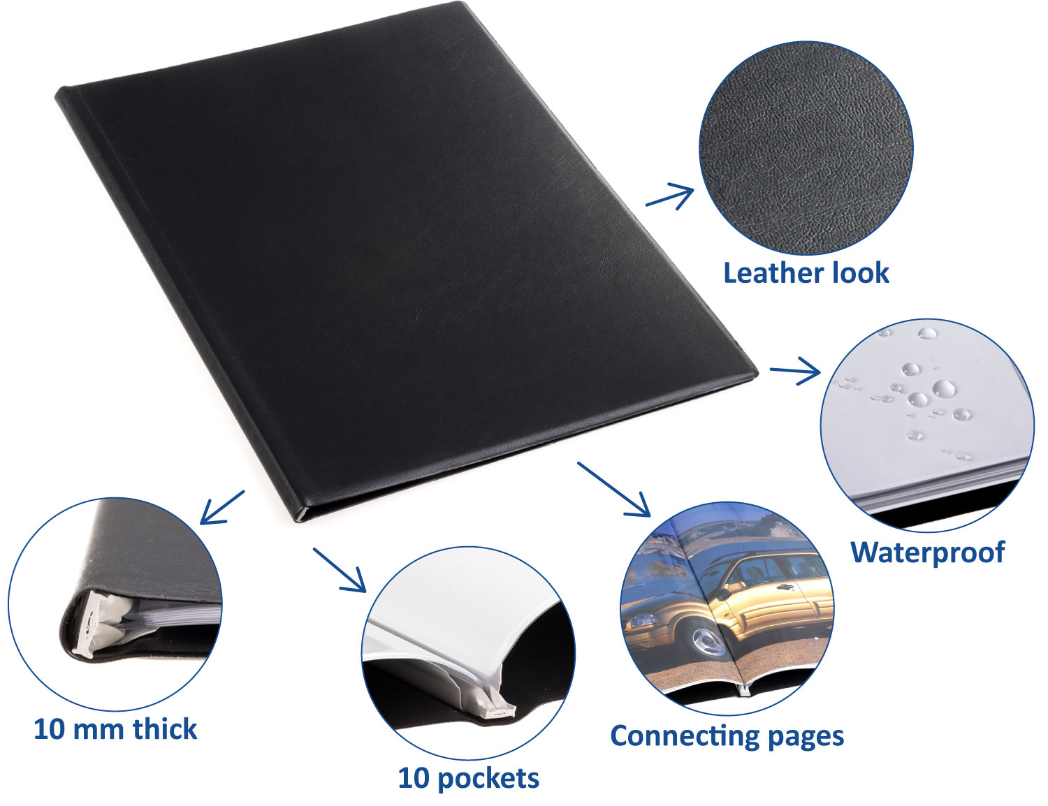 Rillstab Sichtbuch A4 Original aus Kunststoff Material. Rillstab Mechanik = mittels Stäben in Profilen die Innentaschen zusammenhält. A4 Format Inklusiv 10 Innentaschen (= 20x A4) hergestellt aus säurefreiem Polypropylen. Innentaschen aus Polypropylene Material, Dicke Material 50 my, glasklare Innentaschen, reflektieren nicht. An der rechten Innenseite gibt es ein vertikales Einsteckfach über die gesamte Höhe für A4-Dokumente. Farbe schwarz. Blättern wie in einem Buch.