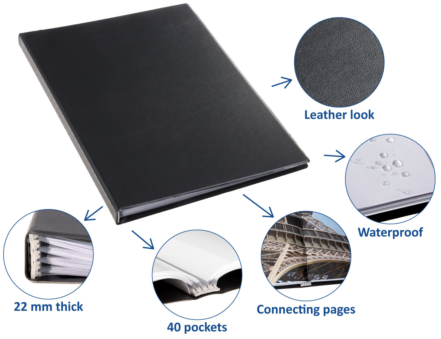 Rillstab Sichtbuch A4 Original aus Kunststoff Material. Rillstab Mechanik = mittels Stäben in Profilen die Innentaschen zusammenhält. A4 Format Inklusiv 40 Innentaschen (= 80x A4) hergestellt aus säurefreiem Polypropylen. Innentaschen aus Polypropylene Material, Dicke Material 50 my, glasklare Innentaschen, reflektieren nicht. An der rechten Innenseite gibt es ein vertikales Einsteckfach über die gesamte Höhe für A4-Dokumente. Farbe schwarz. Blättern wie in einem Buch.