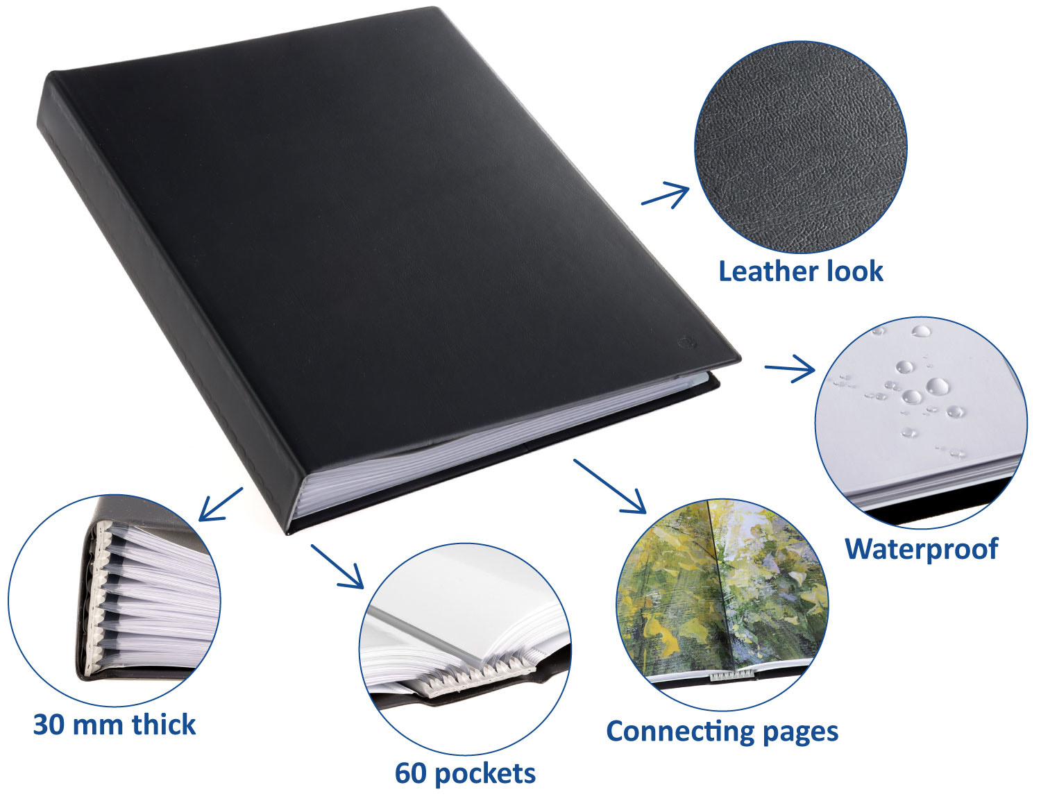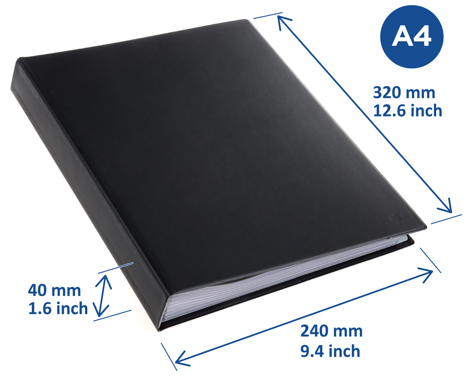 Rillstab Sichtbuch A4 Original aus Kunststoff Material. Rillstab Mechanik = mittels Stäben in Profilen die Innentaschen zusammenhält. A4 Format Inklusiv 80 Innentaschen (= 160x A4) hergestellt aus säurefreiem Polypropylen. Innentaschen aus Polypropylene Material, Dicke Material 50 my, glasklare Innentaschen, reflektieren nicht. An der rechten Innenseite gibt es ein vertikales Einsteckfach über die gesamte Höhe für A4-Dokumente. Farbe schwarz. Blättern wie in einem Buch.
